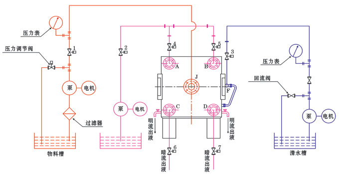 1、明流不可洗機型:A、B、C、D口封死,無洗滌系統,進料過濾時,閥l開啟,壓力調節閥調節流量和壓力, 水嘴出液。壓榨時,閥1關閉,開啟閥3,F進榨水,進行隔膜壓榨。壓榨結束后,開啟回流閥,排出壓榨水。 2、明流可洗機型:C、D口封死,進料過濾時,閥1開啟,壓力調節閥調節流量和壓力,水嘴開啟出液;壓榨時, 閥1關閉,開啟閥3,F進水,進行隔膜壓榨。壓榨結束后,開啟回流閥,排出壓榨水。洗滌時,閥1關閉,洗滌板上的水嘴關閉。開閥2、4、5,A、B口進洗滌水洗滌。 3、暗流不可洗機型:A、B口封死,無水嘴出液、進料時,閥l開啟,閥6、7出液。壓榨時,閥l關閉,開啟閥3,F進水,進行隔膜壓榨。壓榨結束后,開啟回流閥,排出壓榨水。 4、暗流可洗機型:無水嘴出液,進料過濾時,關閉閥4、5,閥1開啟進料,開啟閥6、7出液。壓榨時,閥1關閉, 開啟閥3,F進水,進行隔膜壓榨。壓榨結束后,開啟回流閥,排出壓榨水。若要交叉洗滌,首先開啟閥2、4、 7,關閉閥l、5、6,洗滌水從A、C口進入洗滌板,從B、D口排出,然后關閉閥1、4、7,開啟閥2、5、6,洗滌水從B、D口進入洗滌板,從A、C口排出。